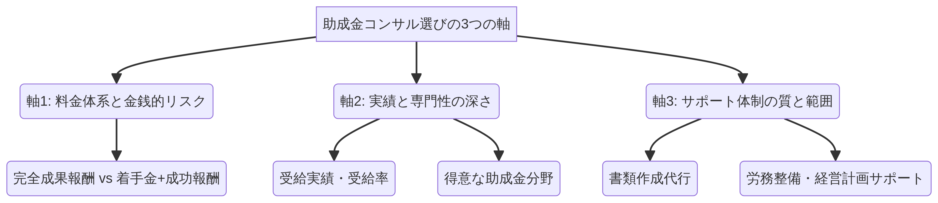 助成金コンサルタントを選ぶ際、単に「成功報酬が安い」という理由だけで決めてしまうのは危険です。専門家として、私たちは以下の3つの比較軸を総合的に評価することを推奨します。この3軸を理解することで、貴社の経営状況と目的に合致した、真に価値のあるコンサルタントを見極めることができます。