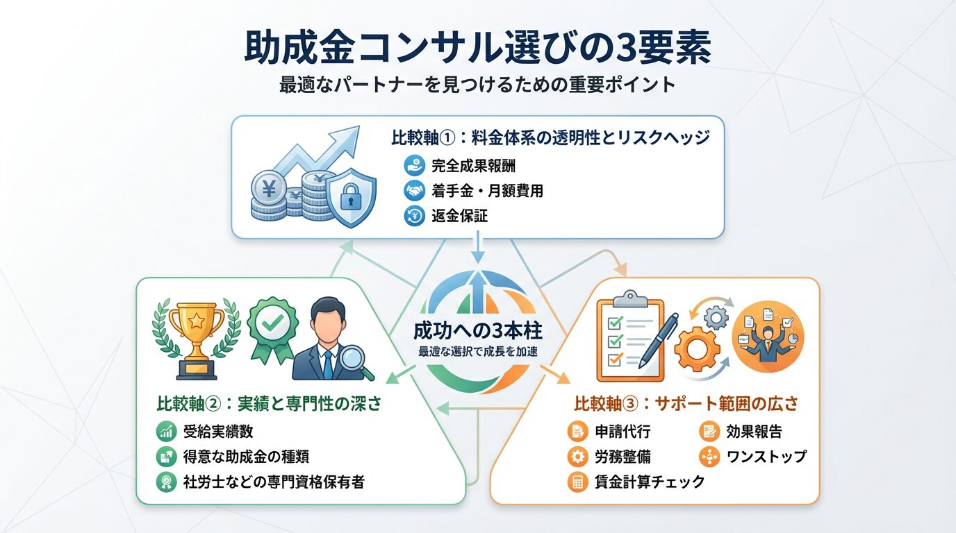 専門家として中立的な視点から評価した結果、失敗しないコンサル選びは以下の「3つの比較軸」で決まります。